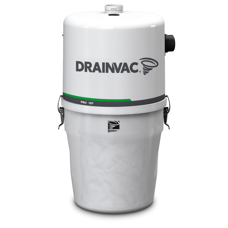 L’aspirateur central Drainvac Pro 107, de format compact (seulement 58 cm de haut), offre une performance d’aspiration exceptionnelle. Pratique, la centrale peut se raccorder sur un réseau PVC allant jusqu’à 80 mètres linéaires.